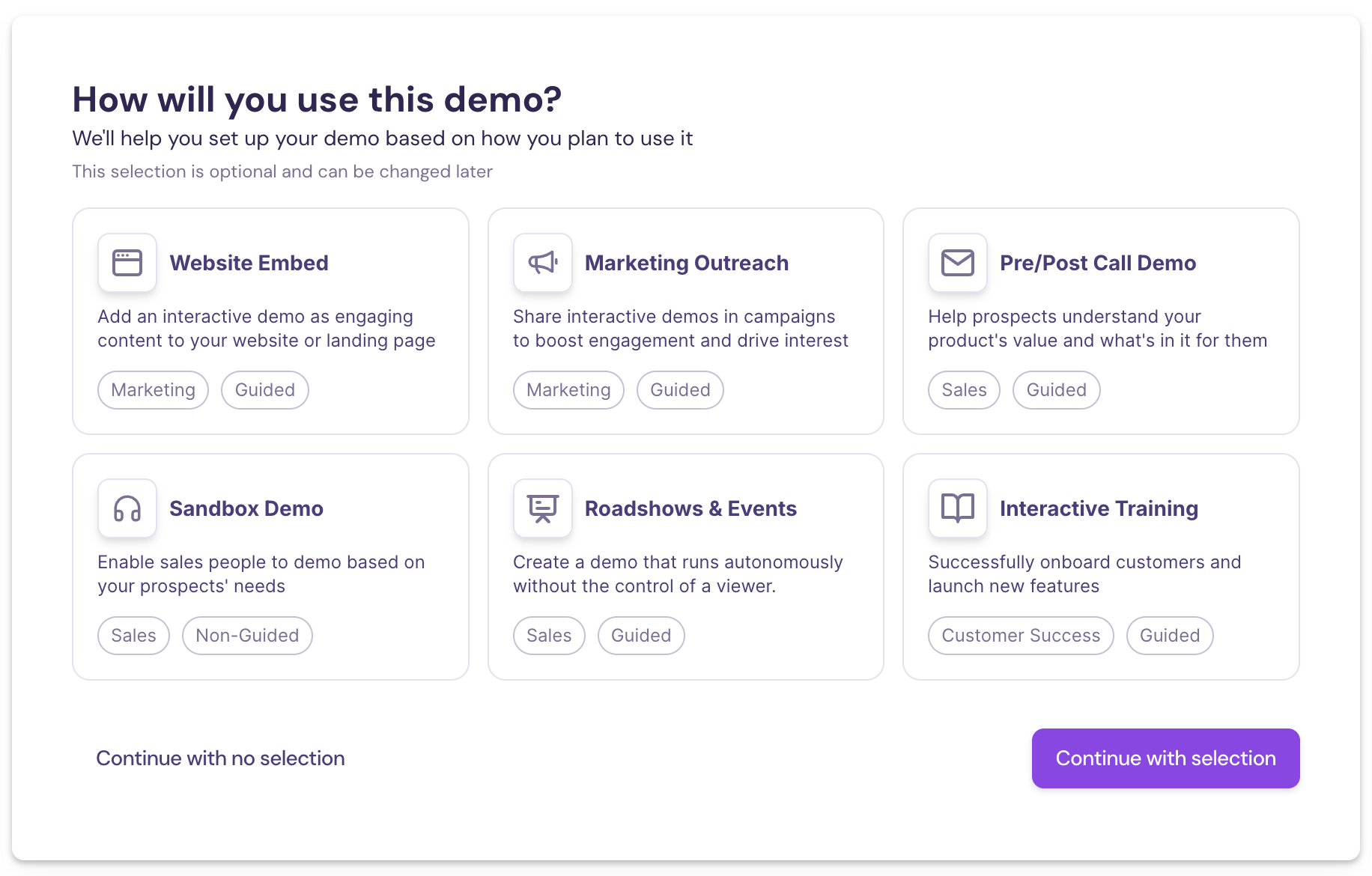 Not every creator is a demo expert. Smart Suggestions guides you toward best-practice use cases as you build, improving demo quality without adding friction to your workflow.