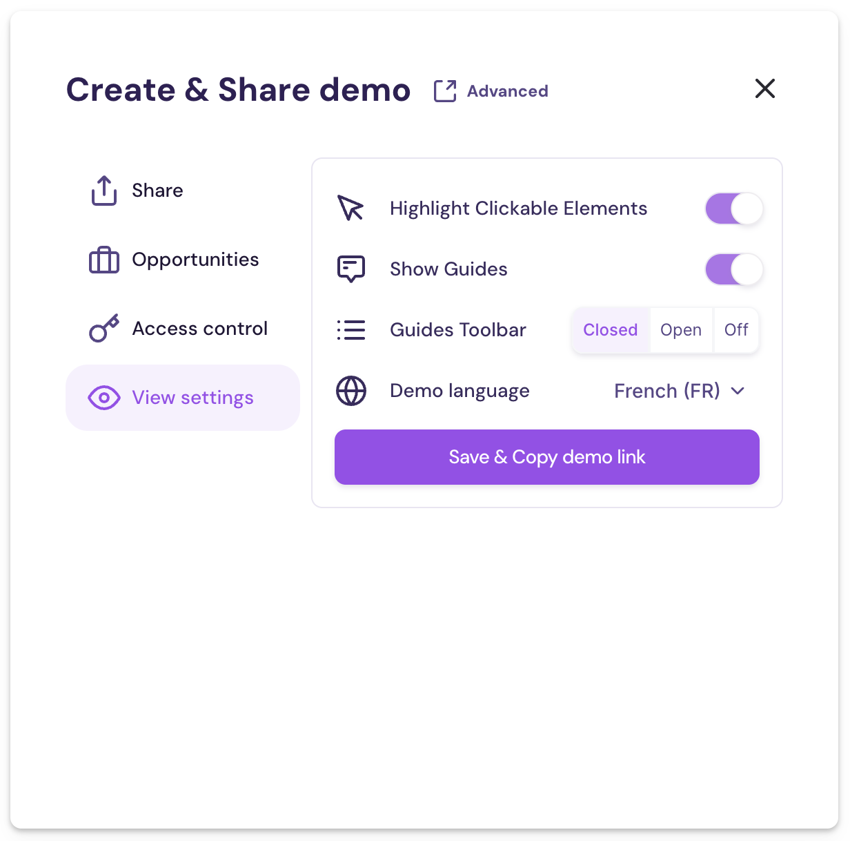 This is where you control the viewer-facing experience, including whether guides appear and which language the demo should open in by default.