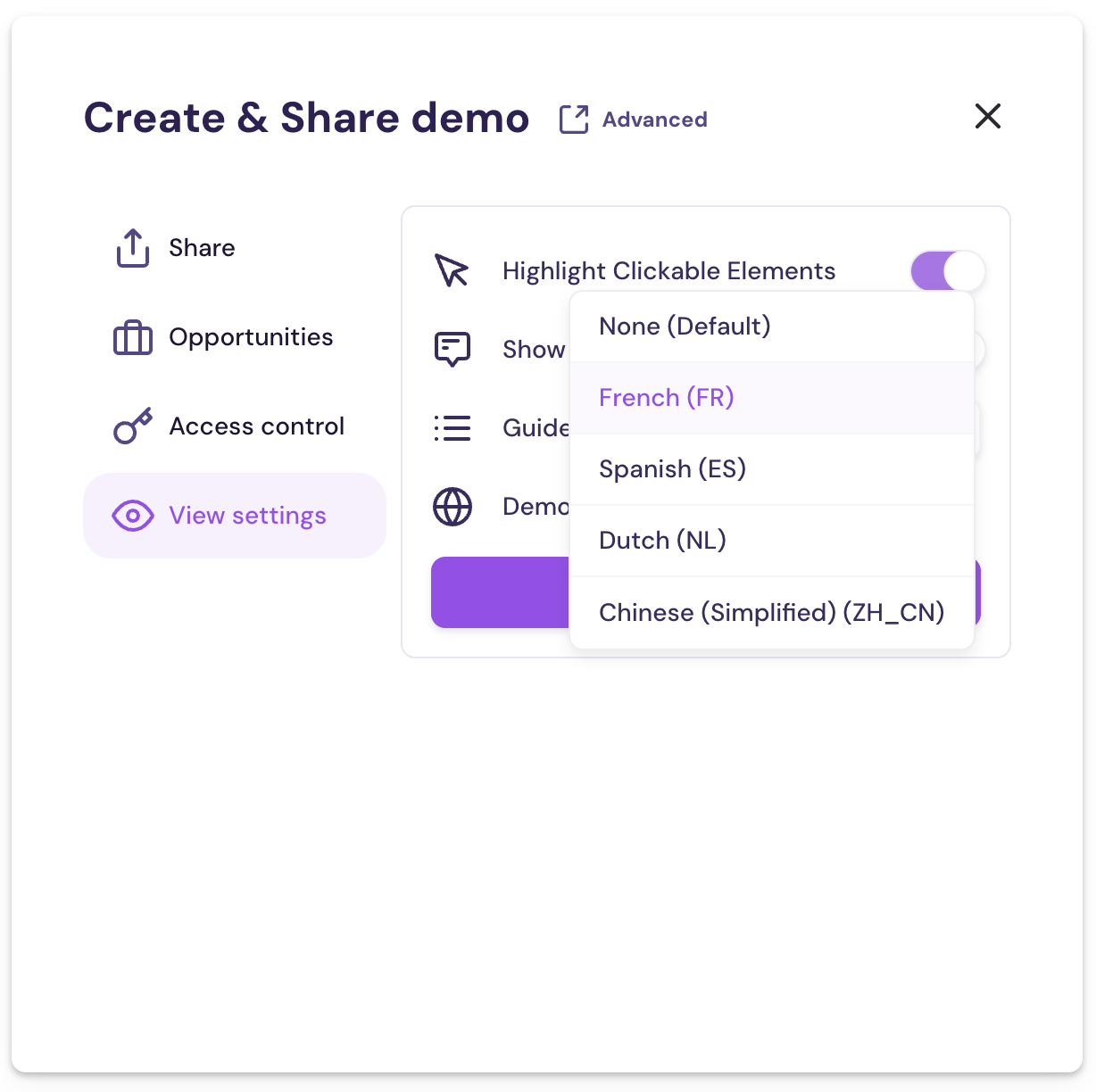 Automatic language detection is usually the best fit for global or mixed-language audiences. If you need a demo to always open in one specific language, such as on a region-specific landing page or Help Center article, use the share setting or embed configuration intentionally.