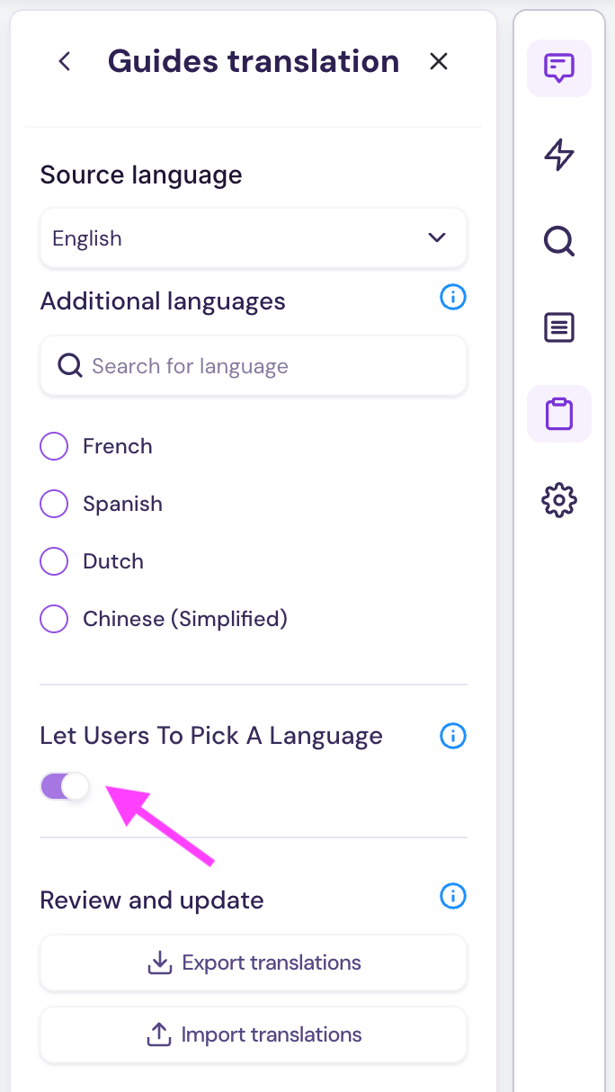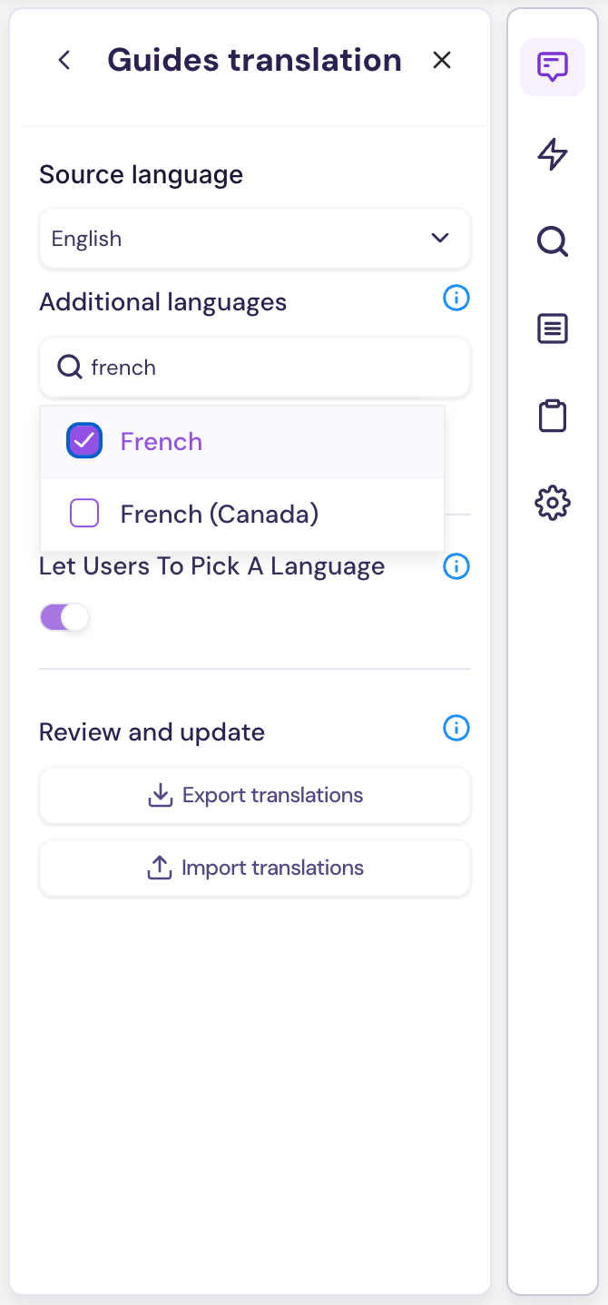 - Add at least one additional language in the Guides Translation section of the Guides panel in your template